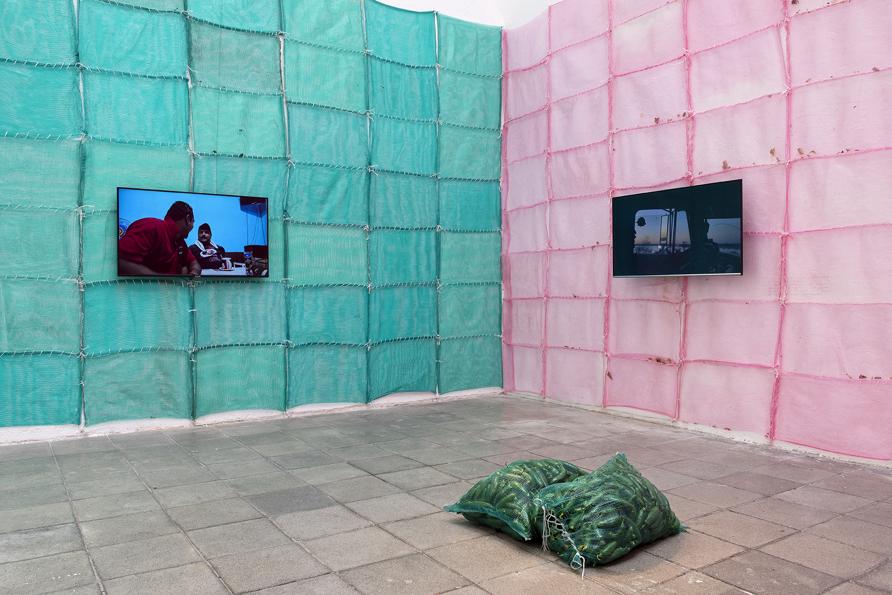 PICO DE GALLO is a project which consists of a video installation of three pieces. For the video documentary homonymous to the exhibition, I used the moving image from the point of view of the witness to reveal the dynamics around the production, distribution and marketing of three products of the basic food basket (chili, onion and tomato), as well as its symbolic relationship with the “mexicanity” and the concept of national identity. The documentary, which was fragmented into three chapters (each one on a screen), was accompanied by two other pieces: a flag made of sackcloth, made to the specific size of the exhibition space and alluding to the colors of the flag, with which I tried to raise the possibility of our sign of identification being represented by a sector of the population that has a great economic and symbolic impact on our society but is usually forgotten. Finally, the exhibition had three mounds of vegetables, one of chili, one of onions and finally one of boxes of tomatoes. For this piece I used the budget granted by the institution divided in three equal parts to acquire what I could afford with that amount for each product.